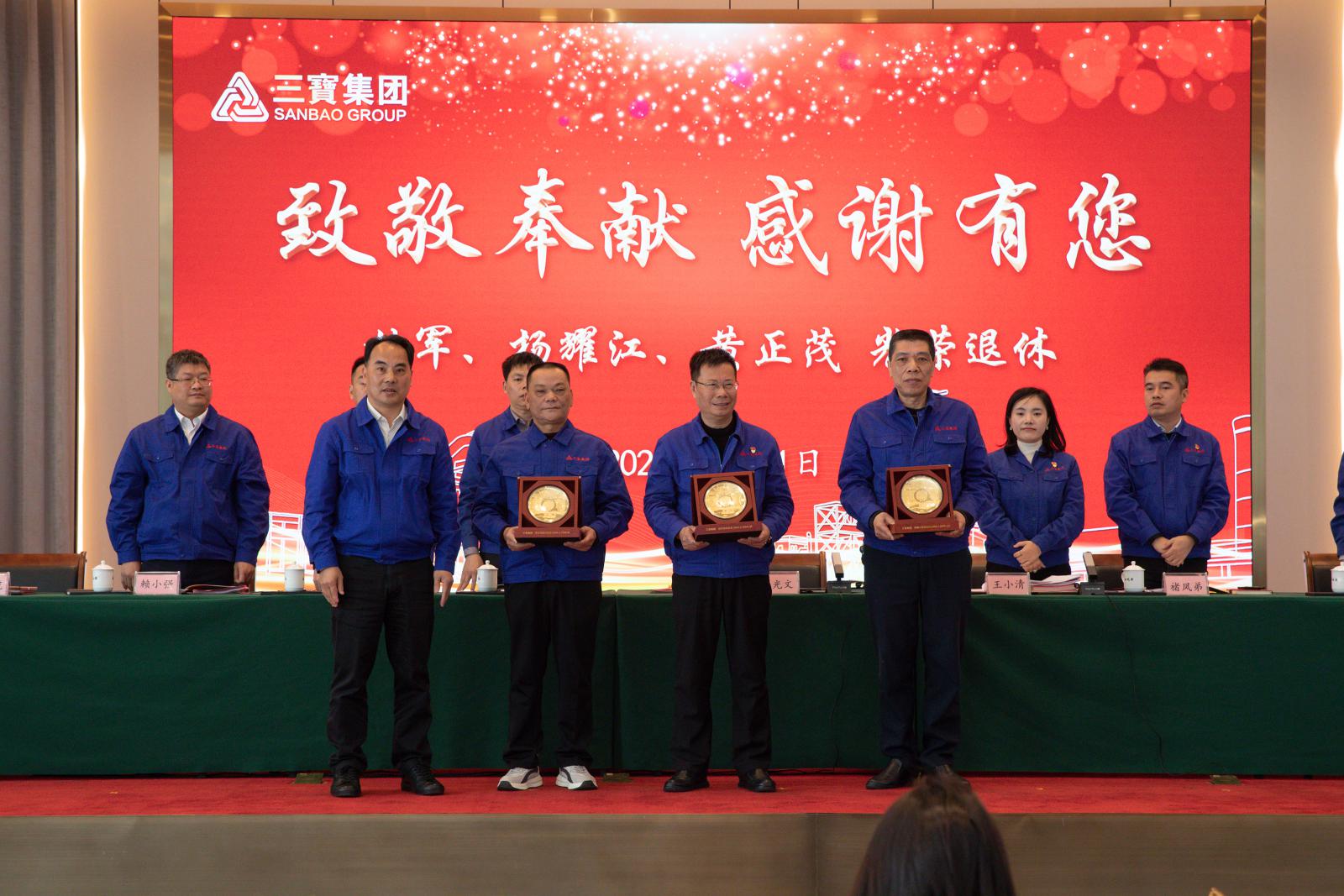 大会举行老干部、老员工庆幸退休仪式,,,,,老干部代表林军揭晓荣退感言。。。。。。。王董事长为林军、杨耀江、黄正茂揭晓庆幸退休纪念金牌,,,,,谢谢他们二十多年来为集团做出的孝顺。。。。。。。